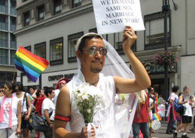 亞裔隊伍由巨大的彩虹字幅“Asian Pride”打頭陣,數(shù)十人演奏亞洲樂器,吸引民眾注意力,緊隨其后的是專門為亞裔女同志設(shè)立的Q-Wave團體!皝喬岚滩÷(lián)盟”(APICHA)主打“免費HIV檢測”計劃,近百位身穿紅色T恤的成員們手舉標(biāo)語,向沿路民眾分發(fā)安全套。很多亞裔同志勇敢展示自己,其中不乏華裔身影。一位身穿結(jié)婚禮服的亞裔男同志,手舉“要求紐約承認(rèn)同性婚姻”的牌子,表達了同志們的呼聲。也有不少同志的支持者參加游行,梁淑儀支持身為女同志的姐姐梁淑安一起來游行,當(dāng)義工的劉健行和劉素夫婦表示有很多同志朋友,大家都是一樣的人,沒有什么不同。(劉爽)