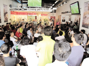 在南非世界杯舉辦期間,紐約華埠和小意大利區(qū)均沾著世界杯的喜氣,不少餐館、酒吧都在比賽時播放賽事,門外還有黑板寫上比賽兩隊介紹!跋愀壅尽笨觳偷晔侨A埠餐飲業(yè)首先這樣做的,餐館內(nèi)張貼了告示:“最低消費4.25元,開賽前30分鐘至散場!鼻蛎远颊f值,因此每場賽事均座無虛席。11日荷蘭與西班牙爭桂冠,更加吸引球迷及準球迷,餐廳內(nèi)爆滿,有的站在門外隔著玻璃看賽事,也感到過癮。