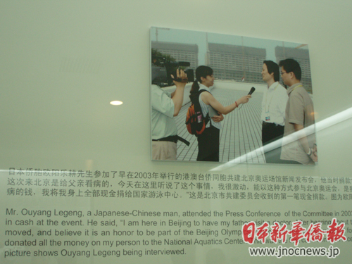 國(guó)家游泳中心“水立方”是由107個(gè)國(guó)家和地區(qū)的35萬(wàn)港澳臺(tái)同胞和海外華僑華人共同捐資9.4億元建設(shè)的。展覽入口處大大書寫著“永不泯滅赤子心”深深打動(dòng)了每一個(gè)在場(chǎng)的人。