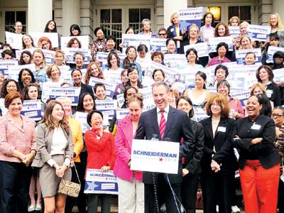 12日下午逾百位各族裔婦女代表云集市府為史樹德造勢(shì),除了市議長柯魁英(Christine C. Quinn)與多位女性政客到來,華埠市議員陳倩雯、還有美東聯(lián)成公所的十多位婦女會(huì)員們均站臺(tái)。她們力挺史樹德,并解釋為何沒有支持同是女性的韋嘉蓮。