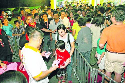 當(dāng)晚,檳州首長林冠英偕夫人及孩子在7時(shí)35分抵步,在大山腳民眾陪同下,切下全馬最大月餅“月光寶盒”,原來月餅內(nèi)藏有一個(gè)寶盒寫著“恭賀各界中秋節(jié)快樂”。