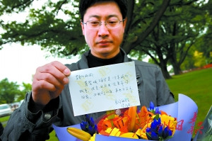 陳先生還特意買了兩束鮮花,其中一束粉紅色的玫瑰是他補送的情人節(jié)鮮花,他在寫給妻子的留言中說:“這次你要永遠留著,不要再扔垃圾桶了!
