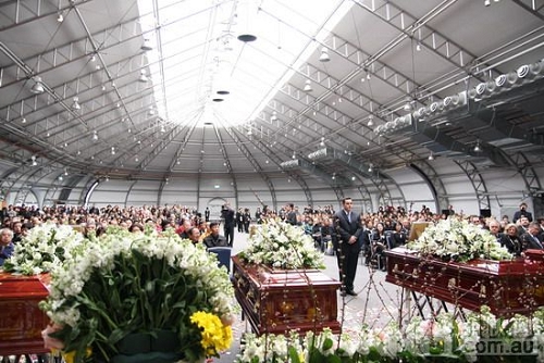 追思會的最后階段,所有親友和來賓陸續(xù)上前,向遺體告別并進獻(xiàn)獻(xiàn)花,會場內(nèi)響起了歌曲《回家》。下午一點,眾人目送靈柩離場。五具靈柩被運送前往麥夸里墓園。