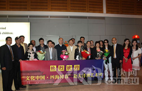 趙陽一行抵達悉尼后,受到胡山總領事等的熱情歡迎,悉尼藝術界、僑界代表拉起橫幅,送上鮮花,熱情歡迎到悉尼作慰問演出的藝術團一行。