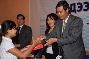 8月31日,漢語征文比賽頒獎儀式在蒙通社新聞中心舉行。駐蒙古使館臨時代辦王福康、蒙通社總編輯英迪拉、《蒙古消息報》主編包勒爾出席,并為獲獎?wù)哳C獎。此次比賽時間雖短,但收到了近30篇作品,共評出1個一等獎、1個二等獎和5個三等獎。獲得一等獎的是蒙古國友誼學(xué)校8年級學(xué)生烏音嘎,獲得二等獎的是今年剛畢業(yè)于上海一所大學(xué)的蒙古留學(xué)生尼亞木巴雅爾。