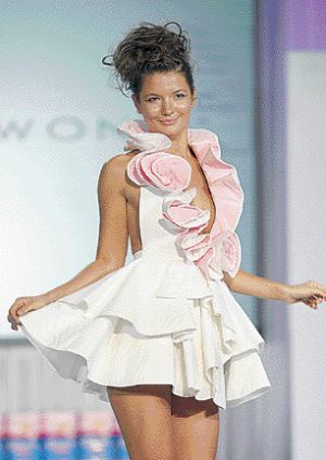 黃嘉宜是來自溫哥華的設(shè)計師。學(xué)時裝設(shè)計的她,在兩年前擁有了自己的時裝公司。她的設(shè)計以性感、女性主義和現(xiàn)代感著稱。她表示,在用廁紙設(shè)計時裝時,首先想到的是要給觀眾一種很難相信這衣服是用廁紙制成的感覺。因此,她特地要體現(xiàn)出與廁紙的柔軟相反的一種挺括的質(zhì)地,于是要在廁紙下加硬襯。結(jié)果是,她的設(shè)計本身就有一種雕塑般的感覺。