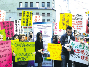當天有不少華人職工會的會員到場聲援,華人職工會也是超越姐妹樓聯(lián)網(wǎng)的組成者之一,居住在下東城的伍嬸代表發(fā)言,她說過去8年來華埠及下城的居民健康仍然被忽略,受到各種疾病的折磨,她與孫女于911后受毒空氣影響,她的肺部出現(xiàn)黑點、孫女患上哮喘,然而政府卻一直不肯正視有關問題。