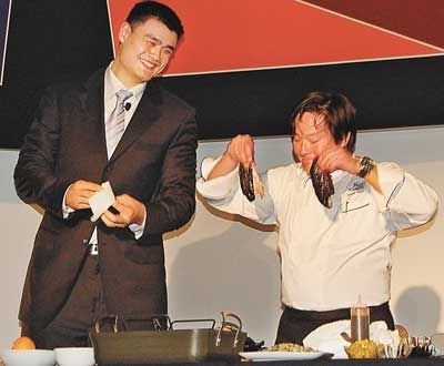 晚宴中最搞笑的節(jié)目莫過于華裔名廚蔡明昊教姚明制作北京烤鴨。蔡明昊不愧為艾美獎得主,烹飪的過程中妙語連珠,連平日口才不錯的姚明都“抖”不出這么多“包袱”。