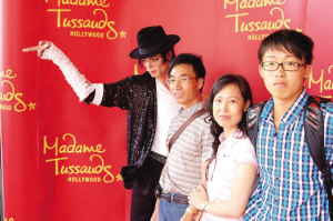 來自深圳的商人陳小興、周娥夫婦是帶著兒子陳曉灝來美看學(xué)校的。陳小興說,從幼年起,麥克爾·杰克遜就是自己的偶像,今天在美旅游途中能看到他的蠟像很幸運(yùn)。天津漢沽一中的高中生王冠一是同父母及外婆來美旅游的,他表示,很新歡麥克爾·杰克遜。從北京來美旅游的袁宗陽、朱瑞龍夫婦,看到麥克爾·杰克遜的蠟像興奮不已,竟然兩次排隊與蠟像合影。