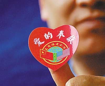 福建公所主席鄭時(shí)甘在東百老匯的募捐攤位上向每位捐款的民眾贈(zèng)送一張印有“愛(ài)的奉獻(xiàn)”字樣和福建公所標(biāo)志的紅色心型貼紙,一方面表示對(duì)捐款者的感謝,一方面希望僑胞能將貼紙傳遞給更多華人,使更多民眾為青海災(zāi)區(qū)獻(xiàn)上愛(ài)心。