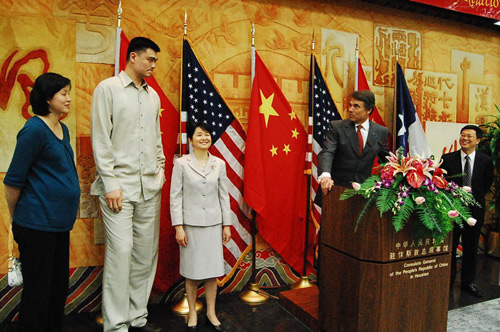 中新網(wǎng)4月28日電 據(jù)美國《美中信使報》報道,中國駐休斯頓總領事高燕平與美國德克薩斯州州長里克.佩里于當?shù)貢r間27日下午5時在總領館會議大廳舉辦“慶祝上海世博會和中國-得州友好關系”招待會。擔任上海世博會形象大使的中國著名籃球明星姚明和他的妻子葉莉以及當?shù)厝A人僑領及學界代表200余人應邀出席招待會。