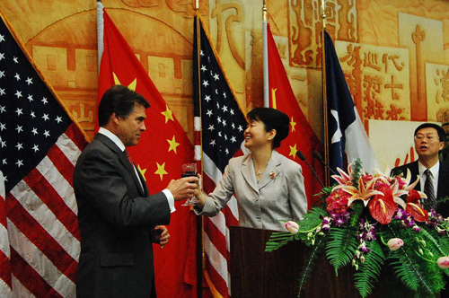 高燕平總領事在招待會上分別用中文和英語致辭,對佩里州長以及來自德州各界的美國朋友及華裔同胞表示熱烈的歡迎。這次世博會德克薩斯州將通過世博園里的美國館,向全中國和全世界展現(xiàn)自己。高燕平表示希望通過佩里州長6月份的訪華,進一步推動中國與德州在各領域的交流與合作,希望佩里州長的訪問順利成功并富有成果。