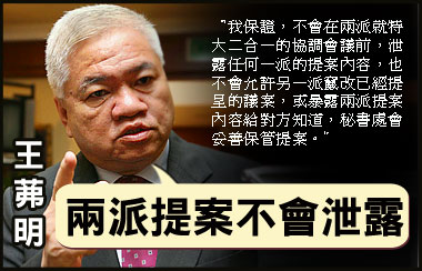 中新網(wǎng)9月9日電 據(jù)馬來西亞《星洲日報(bào)》報(bào)道,馬華總秘書王茀明8日說,他保證不會在兩派就特大二合一的協(xié)調(diào)會議前,泄露任何一派的提案內(nèi)容,甚至允許另一派竄改已經(jīng)提呈的議案,或暴露兩派提案內(nèi)容給對方知道。