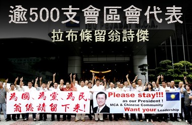 中新網(wǎng)10月15日電 據(jù)馬來西亞《星洲日?qǐng)?bào)》報(bào)道,馬華支會(huì)和區(qū)會(huì)逾500名代表,15日拉起13條巨幅布條表達(dá)心聲,以期力挽總會(huì)長(zhǎng)翁詩(shī)杰留下,繼續(xù)領(lǐng)導(dǎo)馬華進(jìn)行改革。