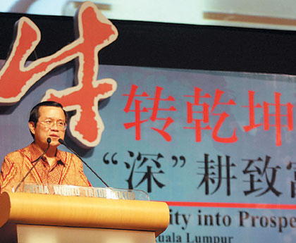 18日活動的主題“牛轉(zhuǎn)乾坤”,翁詩杰也被問到有無信心能夠扭轉(zhuǎn)目前馬華局勢。但是他卻顧左右而言他,僅玩笑式地說“我今天只看到一個很大的牛字,我要捉一只牛來轉(zhuǎn)才可以”。