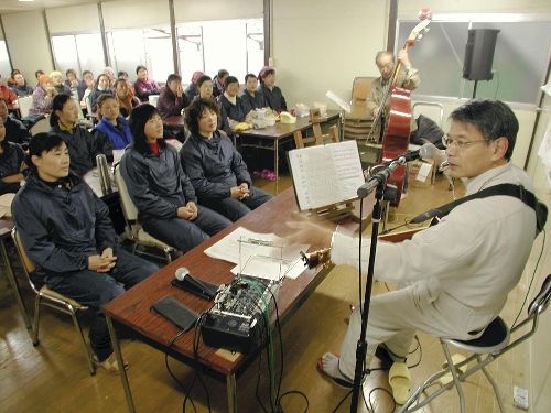 “日中之歌交流會”舉辦當(dāng)天,井村行夫演奏吉他用中文為中國研修生唱出了《大海啊,故鄉(xiāng)》,一些思念故鄉(xiāng)的中國研修生當(dāng)場流下了熱淚。隨后,中國研修生們集體用日語唱出了《四季歌》,把這次的交流推向高潮。(仇棣)