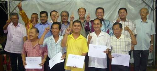 庇勞馬華區(qū)會(huì)主席蔡華輝代表房屋部移交批準(zhǔn)文件予各村長。