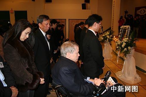 追思會(huì)中午十二時(shí)許在華埠“禮和堂”舉行,臺(tái)上兩側(cè)掛著名家書寫的對(duì)聯(lián):“一代巨星歡樂長(zhǎng)存熒幕上,千秋典范笑顏永在人心中”。舞臺(tái)下正中擺設(shè)肥姐遺照,兩旁放置著白玫瑰白百合花圈。