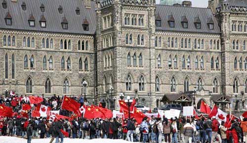 此間媒體發(fā)自現(xiàn)場(chǎng)的報(bào)道說(shuō),渥太華國(guó)會(huì)山莊已經(jīng)變成紅色的海洋,到處飄揚(yáng)著五星紅旗和楓葉旗。組織者估計(jì),與會(huì)人數(shù)可能會(huì)超過(guò)預(yù)期,示威人群幾乎站滿(mǎn)了國(guó)會(huì)山莊前的草坪。