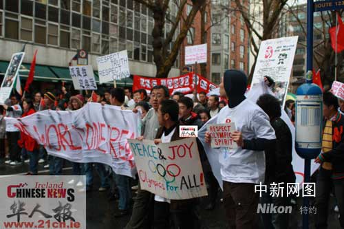 游行隊(duì)伍中最搶眼,人氣也最旺的是一位白發(fā)蒼蒼的愛爾蘭大叔!只見他頭戴繡有奧運(yùn)吉祥物的鴨舌帽,身披奧運(yùn)五環(huán)旗,手持中國小國旗。記者與這位名叫Vincent Lavery的老人交談后,得知他是一名旅居美國的愛爾蘭人,曾于上世紀(jì)80年代去過中國。從那時(shí)起,他就開始關(guān)注中國的情況。在對(duì)中國的飛速發(fā)展感到吃驚的同時(shí),也對(duì)中國引領(lǐng)世界經(jīng)濟(jì)潮流寄予厚望。當(dāng)談到“藏獨(dú)”問題和北京奧運(yùn)時(shí),他說:“我們今天以和平的方式來表達(dá)我們的真心,而‘藏獨(dú)’分子卻以肆意打砸搶燒來換取憐憫!天底下居然有如此猖狂的暴徒!究其原因,還是受人指使,蠱惑人心,破壞奧運(yùn)!奧林匹克精神是屬于全世界人民的!是不容被玷污的!”親切的面容,真摯的理解,帶給在場(chǎng)華人無盡的感動(dòng)!