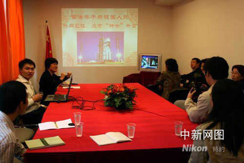 為了能與祖國共同見證這一歷史性意義的一刻,中國駐法使館教育處組織留法學子共同觀看了“神七”發(fā)射的直播節(jié)目。當大家通過屏幕看到“神七”成功問天時,所有人都興奮地鼓起了掌。直播結束后,教育處朱小玉公參主持召開了座談會,大家共聚一堂、各抒己見。