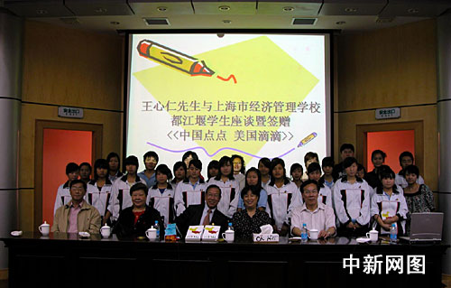 中新網(wǎng)上海10月19日電 10月19日,原美國紐約三江慈善公所主席、現(xiàn)紐約寧波同鄉(xiāng)會會長王心仁先生向申城學子和上海寧波同鄉(xiāng)會贈送著述《中國點點,美國滴滴》儀式在上海市經(jīng)濟管理學校舉行。美國上海聯(lián)誼會會長承立平女士、美國上?偵虝䲡L方關君先生出席了贈書儀式。