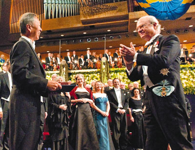 中新網(wǎng)12月11日電 2009年諾貝爾獎頒獎禮昨在瑞典斯德哥爾摩演奏廳舉行,一生獲獎無數(shù)的光纖之父、前香港中文大學(xué)校長高錕,正式從瑞典國王古斯塔夫.卡爾16世(Carl XVI Gustaf)手中接過諾貝爾物理學(xué)獎。期間大會更為他作出特別安排,由國王走到其座位旁邊頒獎,盛裝出席的他,以燦爛的笑容迎接氣氛莊嚴(yán)但歡樂的歷史性一刻。