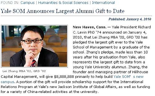 據(jù)耶魯大學公共事務辦公室網(wǎng)站1月4日消息,美國耶魯大學校長理查德·萊文教授宣布,耶魯2002屆畢業(yè)生張磊(音)已經承諾,將向耶魯大學管理學院(SOM)捐贈888萬8888美元。這是到目前為止,耶魯管理學院畢業(yè)生捐贈的最大一筆個人捐款。