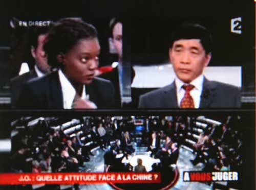 先看一看曲星公使面對(duì)的陣勢(shì):政府人權(quán)事務(wù)國(guó)務(wù)秘書拉瑪·亞德、前社會(huì)黨總理法比、主張抵制北京奧運(yùn)會(huì)的田徑運(yùn)動(dòng)員協(xié)會(huì)代表和對(duì)中國(guó)抱有極深偏見的《解放報(bào)》主編約弗蘭,再加上操縱輿論的主持人:以一敵五。4月7日法國(guó)5臺(tái)辯論節(jié)目《巴黎無圣火》上,鄭若麟一人面對(duì)四人,董純4月13日在《報(bào)亭》參加的辯論會(huì)上共有一名主持人和五名外國(guó)駐法記者,而站在公正立場(chǎng)上的只有一位非洲記者,等于也是一對(duì)四。從一開始,他們就處在這樣的陣勢(shì)中。