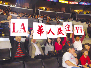 這是易建聯(lián)第一次重返洛杉磯比賽。眾多華裔球迷到場(chǎng)為易建聯(lián)吶喊助威,有的還打出“LA 華人歡迎易”的橫幅。
