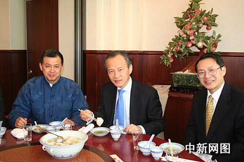 崔天凱大使接著來到中華街上的老字號(hào)東榮酒家,和神戶華僑總會(huì)會(huì)長鮑悅初、株式會(huì)社東榮商行代表王銳輝等當(dāng)?shù)厝A僑代表一邊吃餃子一邊交談,了解餃子事件的各種負(fù)面影響。
