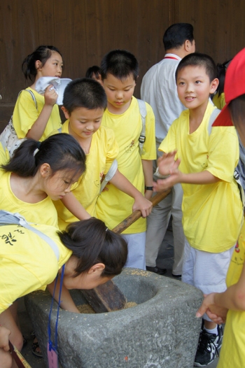 營員們乘坐大巴,途徑剛剛開通的諸永高速,到達目的地永嘉埭頭古村。在村里,他們不僅欣賞到了渾然天成的文房四寶風景,了解了非物質(zhì)文化遺產(chǎn)的“松風水月”古建筑風格,親身感受“棟梁”一詞的深厚含義和古代生活中的尊師之舉,也跟著村里的老人,體驗到了地道的農(nóng)家生活。編草鞋、搓稻繩、磨豆腐、搗米、拔花生、捉田魚,各種各樣的農(nóng)家活動讓孩子們在親近原生態(tài)自然的同時,學到了許多生活的智慧。
