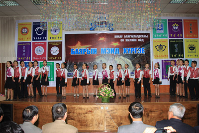 中新網(wǎng)9月27日電 據(jù)中國外交部網(wǎng)站消息,9月25日,為慶祝中華人民共和國成立60周年暨中蒙兩國建交60周年,蒙古首都教育局組織全市開設漢語教學課程的16所中小學校的師生,精心準備了一場有歌唱、舞蹈、柔術、器樂表演等多個節(jié)目的精彩演出。中國駐蒙古使館參贊王?档热w館員、蒙古首都教育局局長恩赫巴雅爾及上述各校校長觀看了演出。
