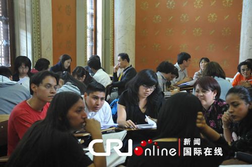 在本次培訓班上,有一個人一直吸引著記者的目光,她的雙鬢已經斑白,一縷麻花辮上系著一個小小的中國結。她名叫庫埃亞爾,是這期培訓班里年齡最大的學員。1985年,庫埃亞爾曾來到中國研修漢語語言學,兩年后她回到墨西哥,開始從事漢語教學,一轉眼便是二十余載。對于學習漢語,庫埃亞爾有自己獨到的體會。她說:“我覺得如果你開始學習漢語,你不能停,因為沒有辦法,你停不了,停了不行,因為漢語是比較難、也比較豐富的一個語言。所以如果你停止學習,你的漢語水平(就會)越來越差。學習漢語(讓)你有一個非常大的機會了解到世界很大。所以我覺得真的學習漢語越學越喜歡!