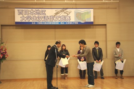 12月20日,中國(guó)駐大阪總領(lǐng)事館教育室在立命館大學(xué)舉行了西日本地區(qū)大學(xué)生中文作文比賽頒獎(jiǎng)儀式。教育室主任劉占山為獲得一等獎(jiǎng)的神戶(hù)市立外國(guó)語(yǔ)大學(xué)的渡部恒介同學(xué)頒發(fā)了榮譽(yù)證書(shū)和三萬(wàn)元的圖書(shū)卡獎(jiǎng)品。立命館孔子學(xué)院院長(zhǎng)周瑋生為獲得二等獎(jiǎng)的龍谷大學(xué)的北村籃子和關(guān)西外國(guó)語(yǔ)大學(xué)的增瀨有佑同學(xué)頒發(fā)了榮譽(yù)證書(shū)和一萬(wàn)元的圖書(shū)卡。獲得三等獎(jiǎng)的同學(xué)有龍谷大學(xué)的韓國(guó)留學(xué)生權(quán)純睦、神戶(hù)市外國(guó)語(yǔ)大學(xué)的油谷優(yōu)太、京都外國(guó)語(yǔ)大學(xué)相川瑞穗和神戶(hù)松蔭女子大學(xué)的古川翠。