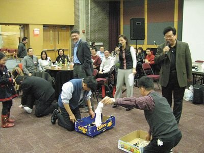成語接龍和逢七數(shù)數(shù)也引爆了全場的笑聲,使全場沸騰的則是游戲“七拼八湊”。游戲中,呂敏偉將與會者分為“左派”和“右派”,要求兩派老師同心同德,以最快速度籌集現(xiàn)場報出的物品。兩派人員總動員,紛紛將手表、錢、書包、鋼筆、口紅等取出,拋進(jìn)箱子。最令人捧腹的是,有的老師脫下了襪子,獻(xiàn)出了皮帶,最后由右派險勝。當(dāng)天聯(lián)歡會上到處充滿歡聲笑語,以及對彼此的新年祝福。