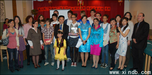 第三屆“漢語橋”匈牙利賽區(qū)的第一名由匈中雙語學(xué)校的心情獲得,王慶年為她頒發(fā)了獎(jiǎng)狀和獎(jiǎng)品;第二名由羅蘭大學(xué)孔子學(xué)院的丹尼爾、周德偉,東方語言學(xué)校的李麗獲得,艾爾戴伊校長(zhǎng)為他們頒發(fā)了獎(jiǎng)狀;其余的同學(xué)獲得了三等獎(jiǎng),賽后全體成員合影留念。