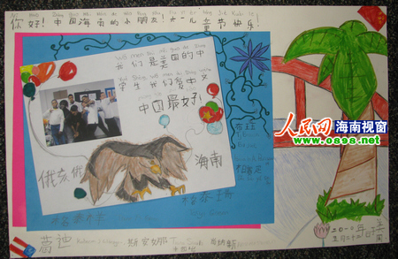 記者從任老師提供的圖片上看到,在卡片的上部,寫著“你好!中國海南的小朋友!六一兒童節(jié)快樂!”的字樣,卡片的左下角畫著一個(gè)美國國旗代表美國,右上角畫著一個(gè)中國國旗代表中國,卡片中央畫著一只雄鷹作為美國的象征,雄鷹的嘴里銜著兩端系滿五彩氣球的絲線,絲線將“俄亥俄”和“海南”連接起來,在雄鷹的上方,寫著“我們是美國的中學(xué)生,我們愛中文,中國最好”并貼著卡片作者的照片。卡片右側(cè)的椰子樹代表海南,在海南和俄亥俄之間,架起了一座象征友誼的大橋?ㄆ蚁陆堑臅r(shí)間顯示,這張祝?ㄖ谱饔诋(dāng)?shù)貢r(shí)間5月22日。