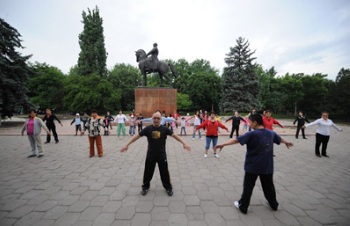 每周二與周五早上八點(diǎn),武術(shù)班都要在比什凱克市內(nèi)街心公園練習(xí)一小時,此舉吸引了不少過路人的觀看和參與,成為了一道別具特色的風(fēng)景線,很受當(dāng)?shù)孛癖姎g迎。