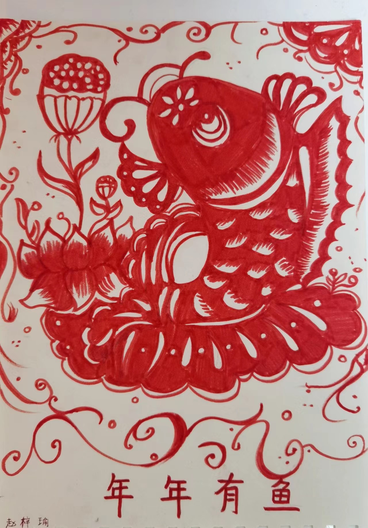媽媽每年過年時都會在窗戶上貼上不同的剪紙窗花。在今年春節(jié)時,我就畫了一幅剪紙風格的年畫,這樣我們就可以一直把它掛在墻上,年年有余。
