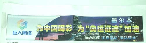 有讀者昨天向記者曝料,巨人網(wǎng)絡(luò)在某報(bào)上打出的“為‘奧運(yùn)征途’加油”廣告涉嫌違反奧林匹克知識(shí)產(chǎn)權(quán)保護(hù)的相關(guān)規(guī)定。
