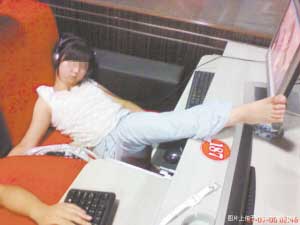 在這些被張貼出來(lái)的照片中,記者看到,有個(gè)漂亮妹妹戴著耳機(jī)不知道是在瞇著眼睛聽(tīng)音樂(lè)還是已經(jīng)睡著了,一條腿放在電腦桌上;大多數(shù)上網(wǎng)者要么蜷縮在沙發(fā)上要么就坐在凳子上酣然熟睡;有的上網(wǎng)者手放在鍵盤上,可眼睛卻已經(jīng)閉上,嘴巴大張著;還有的則是男女混合躺在一起,任憑電腦屏幕閃個(gè)不停。