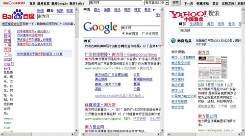 看到這個(gè)頁面,你一定會(huì)覺得很“雷”吧!還有更“雷”的在后面,為驗(yàn)證搜索效果,記者嘗試輸入“南方網(wǎng)”進(jìn)去搜索,發(fā)現(xiàn)搜索出來的結(jié)果、頁面也是和百度、谷歌、雅虎一樣,只不過是把三大網(wǎng)站搜索結(jié)果進(jìn)行了并列排放。