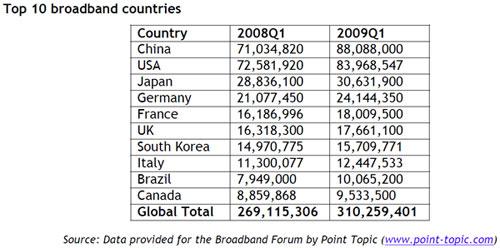報(bào)告顯示,今年第一季度全球新增1660萬(wàn)條寬帶線路,使總線路達(dá)到4.292億條。其中,中國(guó)寬帶線路為8808萬(wàn)條,排名首位。美國(guó)為8396萬(wàn)條,位居第二。日本為3063萬(wàn)條,排名第三。第四至第十位排名依次為德國(guó)、法國(guó)、英國(guó)、韓國(guó)、意大利、巴西和加拿大。