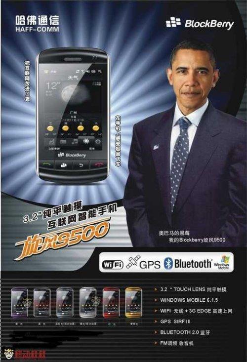 據(jù)國外媒體報道,中國一家名為“哈佛通訊(HAFF-COMM)”的山寨手機廠商發(fā)布了一款RIM黑莓(BlackBerry)山寨機”BlockBerry旋風 9500“,令人意外的是,美國總統(tǒng)奧巴馬(Barack Obama)竟然出現(xiàn)在該款手機的宣傳海報上。