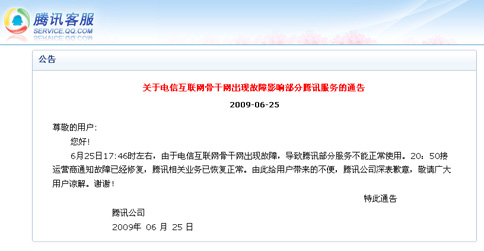 昨晚20時(shí)20分許,記者在騰訊官方網(wǎng)上看到一則《關(guān)于運(yùn)營商設(shè)備故障影響部分騰訊服務(wù)的通告》已經(jīng)發(fā)布,回應(yīng)稱:6月25日17時(shí)46分左右,由于電信運(yùn)營商出現(xiàn)設(shè)備故障,導(dǎo)致騰訊部分服務(wù)不能正常使用。騰訊正在積極配合運(yùn)營商進(jìn)行故障排除。