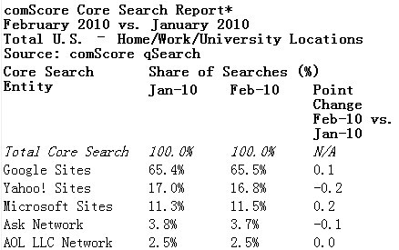 谷歌網(wǎng)站以65.5%的市場(chǎng)占有率繼續(xù)領(lǐng)跑美國(guó)核心搜索市場(chǎng),緊跟其后的是雅虎網(wǎng)站(16.8%)以及微軟網(wǎng)站(11.5%)。Ask Network和AOL所占份額分別為3.7%和2.5%。