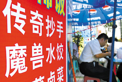 “來(lái)二兩魔獸餃子,再來(lái)一份屠龍刀!”凌晨1點(diǎn),在網(wǎng)吧拼殺5個(gè)小時(shí)后吃碗餃子,已經(jīng)成了網(wǎng)友“丁丁貓”的習(xí)慣。近日,在解放碑附近,一家以網(wǎng)絡(luò)游戲以及道具名稱命名的面食店,逐漸走紅于街坊和網(wǎng)絡(luò)間。