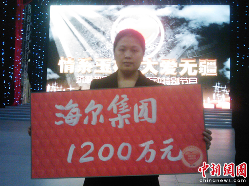 中新網(wǎng)4月21日電 4月20日,由中宣部、國家廣電總局、民政部、中國紅十字會主辦,中央電視臺承辦的《情系玉樹 大愛無疆--抗震救災大型募捐活動特別節(jié)目》在中央電視臺現(xiàn)場直播。海爾集團在現(xiàn)場向災區(qū)捐款1200萬元,全力支持災區(qū)緊急救災和災后重建工作。