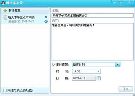很多朋友都有“健忘”的小毛病,一些不重要的事情忘了倒沒什么,公司的一次重要會議要是忘記了,后果就嚴重了!QQ2009中內(nèi)置了網(wǎng)絡提醒功能,可以將一些重要事件提前添加到提醒列表中,這樣就不會因小毛病而誤了大事。單擊主面板中的“菜單→工具→網(wǎng)絡備忘錄”,在打開的窗口中設(shè)置好具體的提醒內(nèi)容及提醒時間即可。提醒的時間可以具體到某個點也可以設(shè)置每天、每周的某個固定時刻的提醒。如果是QQ會員,還可以設(shè)定“自動漫游”,這樣在任何一臺可上網(wǎng)的電腦中,之前設(shè)定的網(wǎng)絡提醒都有效。